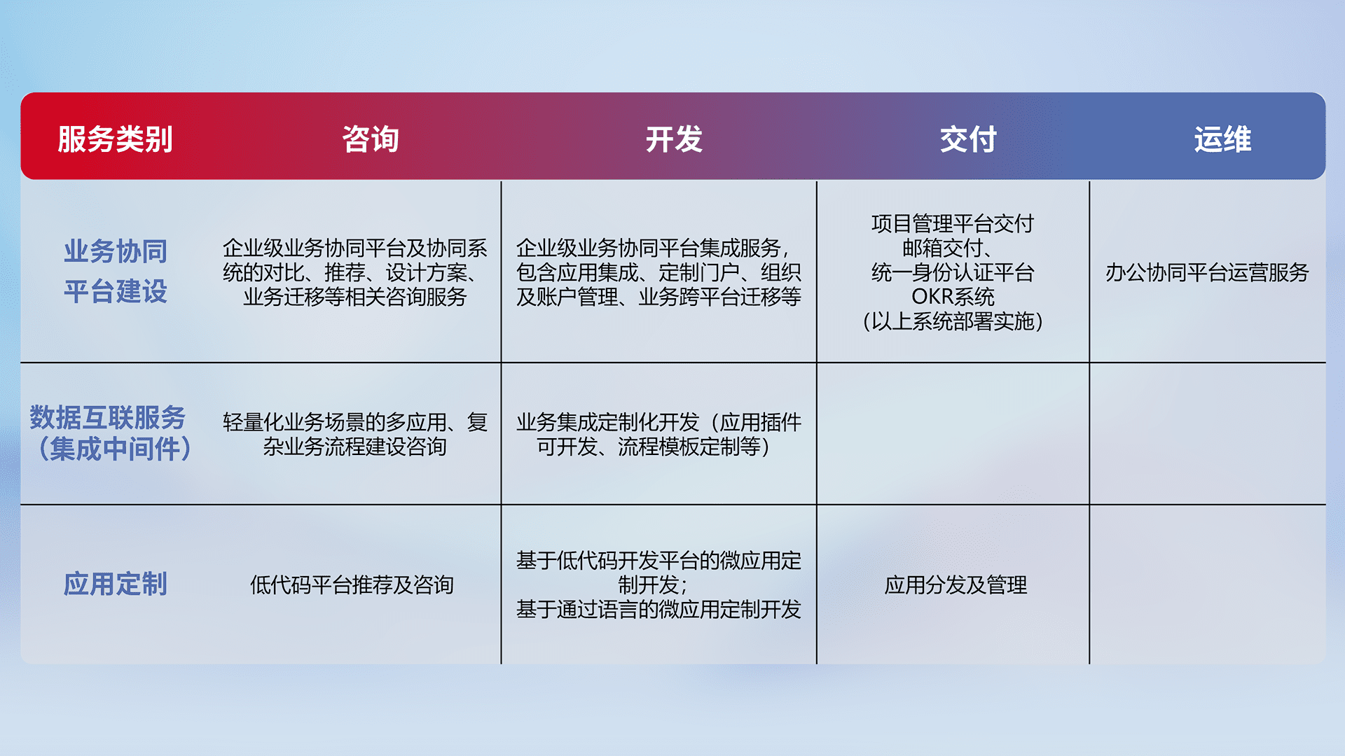 针对钉钉、、、、企微、、、、IDaas等平台级产品提供产品的规划、、、、方案、、交付、、、定制化开发等服务,,,实现如统一协同办公、、智能客户服务、、、混合会议管理、、智能数据查询、、、等业务场景,,实现数字化转型。。