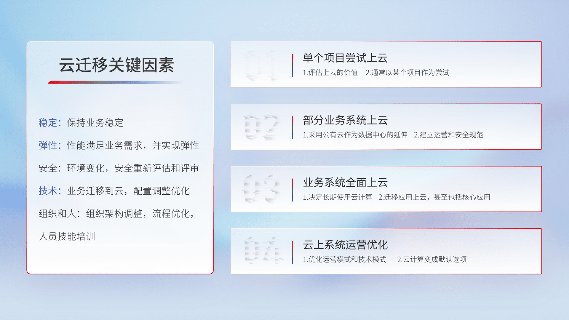 结合实际业务,,从规划设计、、云平台选型、、、云原生改造、、、数据迁移、、、、集成交付,,迁移全过程为客户识别最佳上云路径,,做好风险识别管理,,,,设计网络架构、、身份权限、、、、安全审计合规、、操作审计、、、日志审计、、、、监控告警策略、、、多站点容灾设计等,,,对云上基础设施进行整体规划,,,,提升IT治理水平,,,以满足弹性、、、、高可用、、、、高性能的需求。。。。