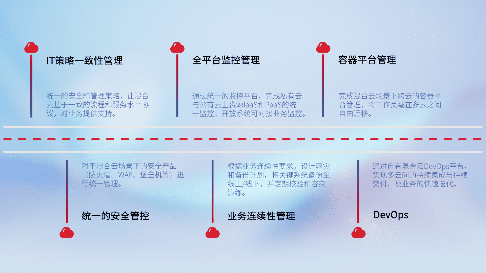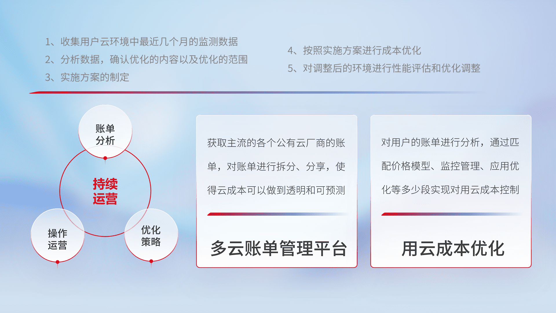 通过多云纳管,,以统一的资源数据模型把客户的云资源进行抽象和封装,,,进而实现对多云资源的统一操作,,保障云资源管理的可靠性、、、稳定性与可用性。。。。量身定制化运维内容,,配置、、、开发运维、、补丁管理、、、备份、、、、监控、、、、认证和访问管理、、审计和日常巡检等,,保障在用云过程中的可靠度,,,稳定度以及高可用率。。