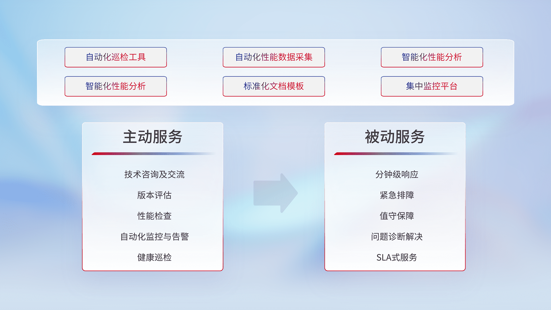 智能化工具和标准化文档,,,保障服务质量,,提供主动服务(包含技术咨询、、、版本评估、、、性能检查、、、、自动化监控与告警、、、健康巡检)和被动服务包含(分钟级响应、、紧急排障、、、值守保障、、、问题诊断解决、、SLA服务)。。。